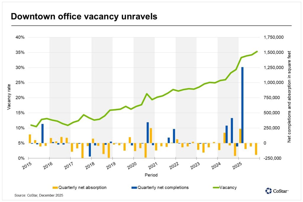 Vacancy climbs above 35% By Joshua Ohl via Costar CoStar Analytics December 9, 2025 | 11:11 AM Downtown San Diego’s office