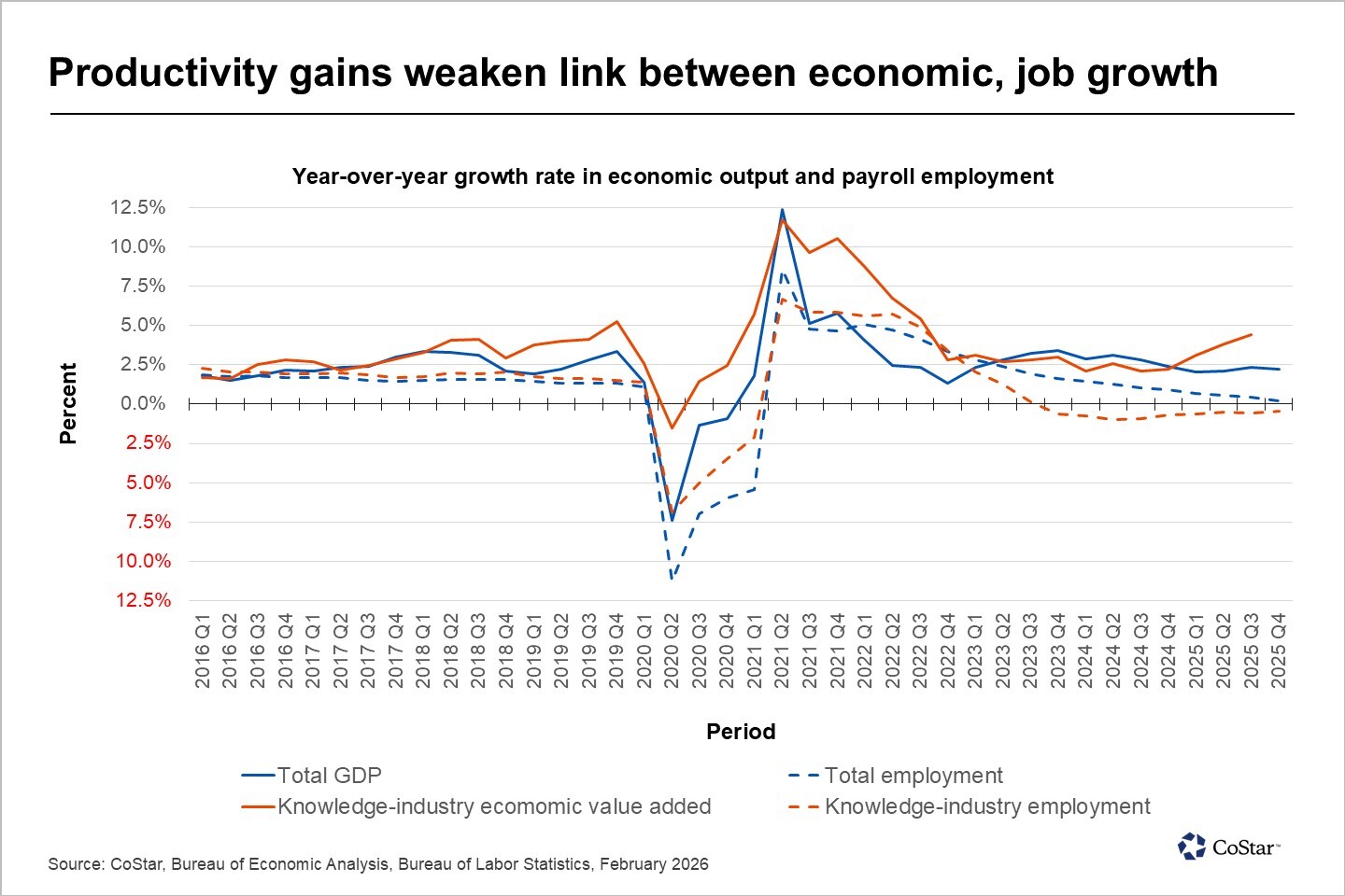 Labor productivity increased dramatically in 2025. Gross domestic product, or GDP, increased at a rate roughly between 2.0 and 2.5%, while job growth continued to decelerate to a rate barely above zero by the end of the year.